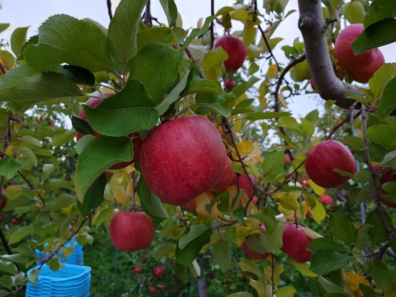 通常、ふじは着色をよくするため(果皮の赤色は一定の低温と太陽の紫外線でアントシアニンが生成されることによる)収穫近くになると葉を摘む作業がされるが、敢えて葉を積まずに果実の食味(葉における光合成産物の果実への転流により果実肥大や果肉糖度が促進される)を重視した栽培方法で生産されたふじ。究極のサンふじと言える。