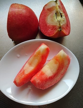 平均果実重はふじと同程度。果形は長円錐形~円形。果皮は熟期前は黄色ですが、熟期に近づくと最大の特徴である果肉の赤さが増し、透けて果皮が橙色に見える。蜜入りすることもあり、食味良好。